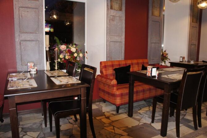 По утрам постояльцев ждут сытные английские завтраки. На столах – мясные и сырные ассорти, омлеты с различными добавками, молочные продукты, мюсли и хлопья. А закончить трапезу можно бодрящим кофе, ароматным травяным чаем или стаканом фреша.
