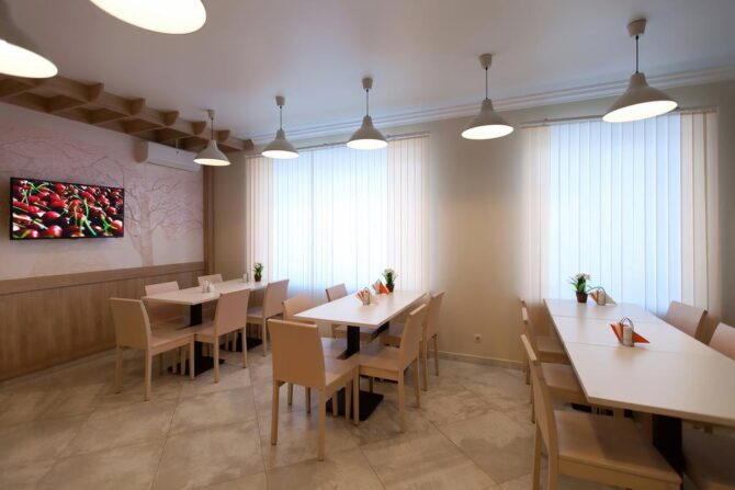 Кафе русской кухни организует завтраки или полупансион, а при желании, вы можете заказывать еду по меню в любое удобное время.