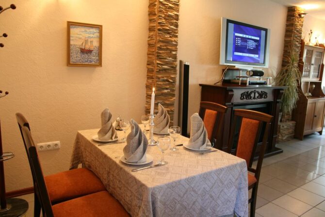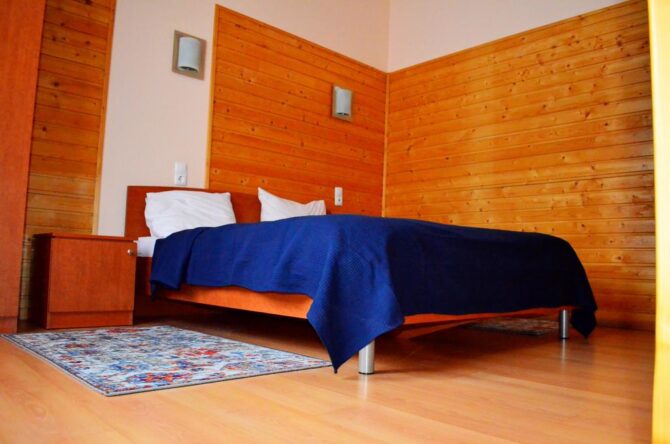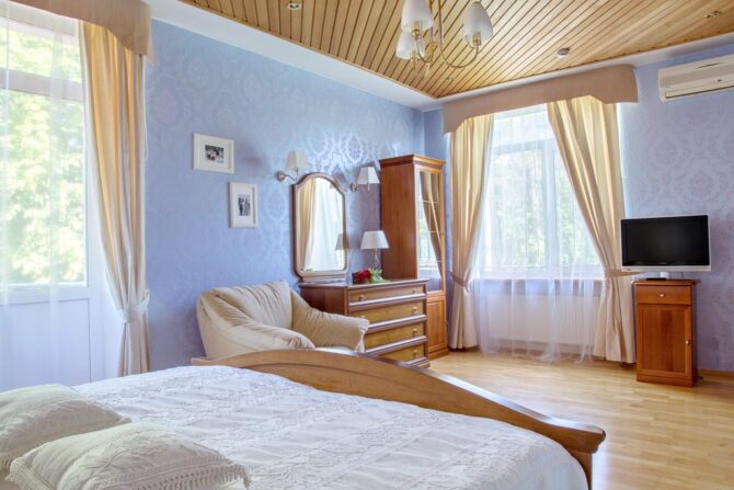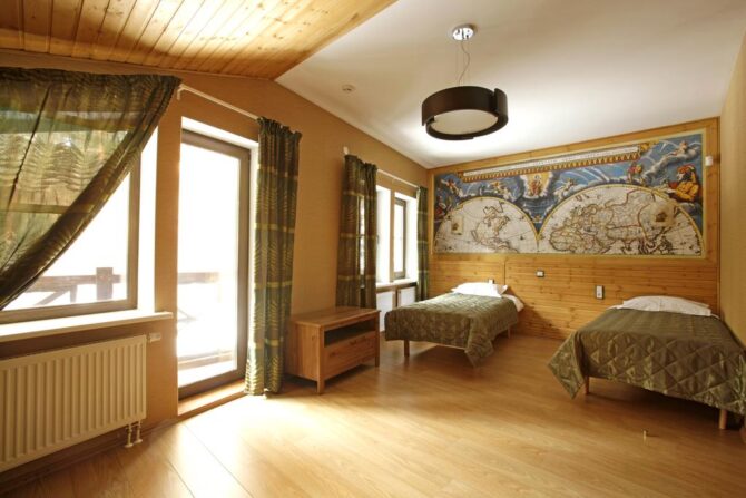 Заведение подходит как для отдыхающих с малышами, так и для проведения корпоративных мероприятий. К вашим услугам – более 100 просторных номеров, каждый из которых оформлен в индивидуальном стиле. В стоимость проживания входит посещение спортивного зала, бани или сауны.