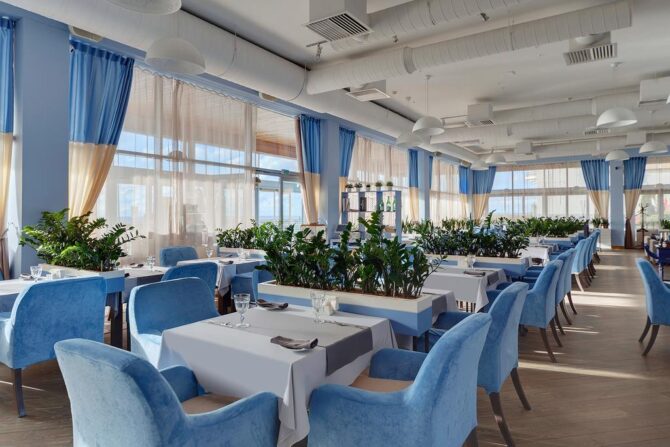 Панорамный ресторан «Жемчужина» предполагает питание по системе «полный пансион», «только завтраки» или «полупансион». Если проголодаетесь, всегда можно сделать заказ по меню или перекусить в баре. Помимо основных блюд, в ассортименте масса вариантов для деточек и путешественников, соблюдающих диету.
