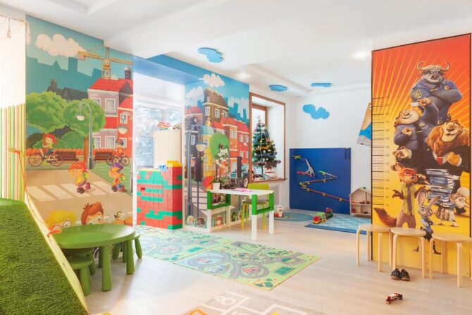 Детская комната оборудована игровыми уголками, столиками для рисования и лепки из пластилина, безопасными игрушками, небольшим кинотеатром, где ребята могут посмотреть любимый мультик или передачу. Пока за малышами присматривают аниматоры, взрослые наслаждаются приятным времяпрепровождением в СПА-комплексе. Закрытые и открытые бассейны с подогревом позволяют гостям купаться в любую погоду.