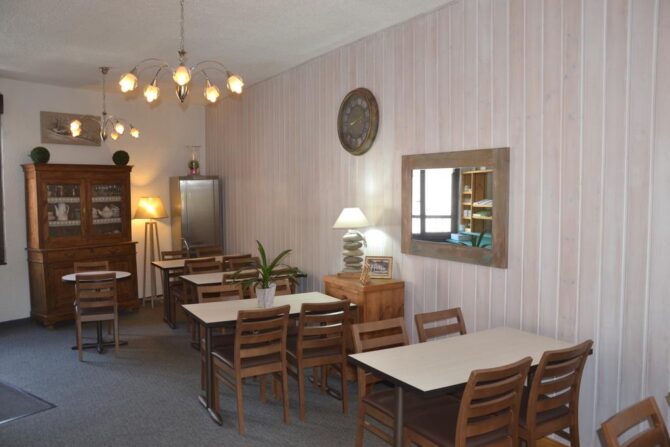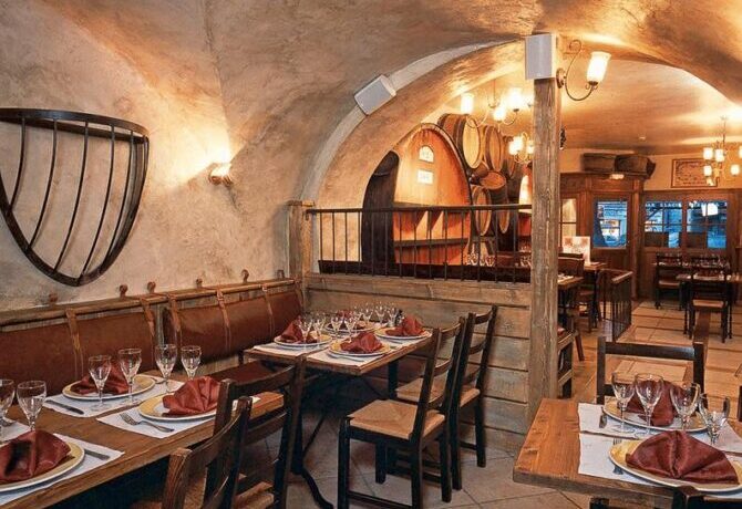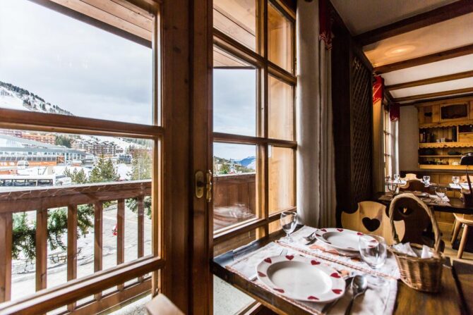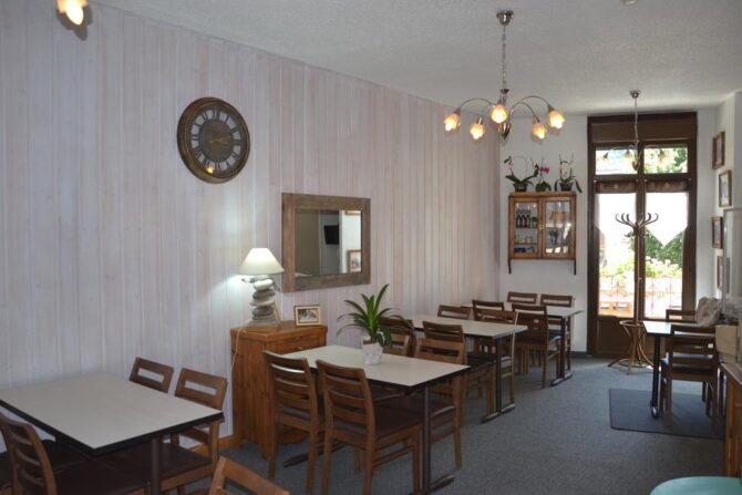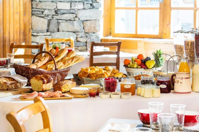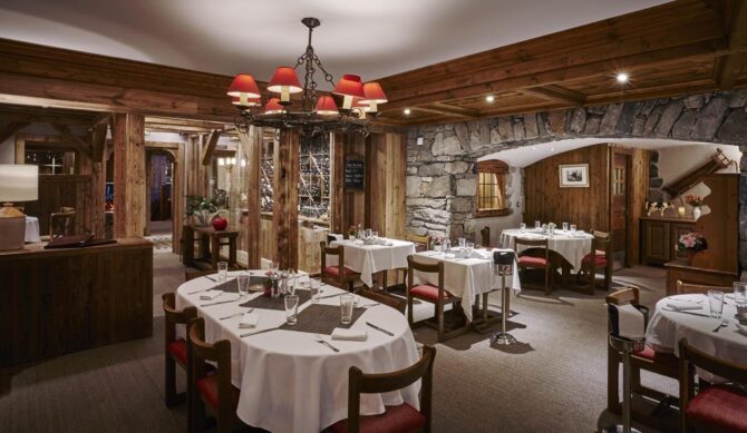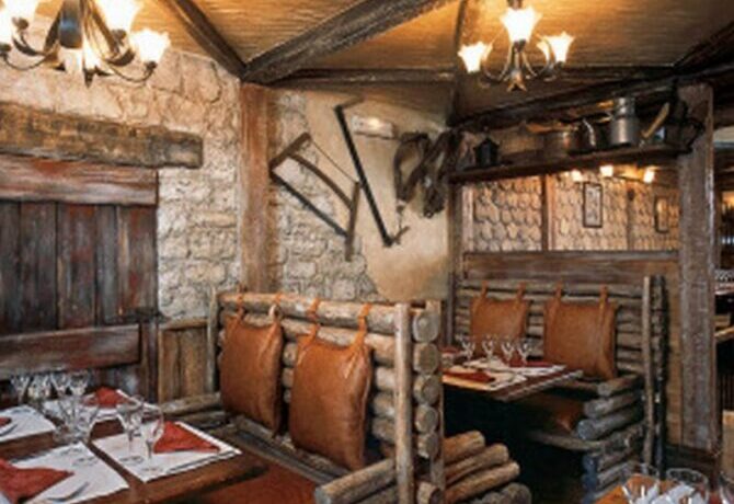 В столовой витает атмосфера старинной деревни и винного погреба. Деревянные лавочки и столешницы, открытый камин – все это добавляет тепла и уюта. Кухня здесь местная, савойская. Подают и национальные французские блюда.