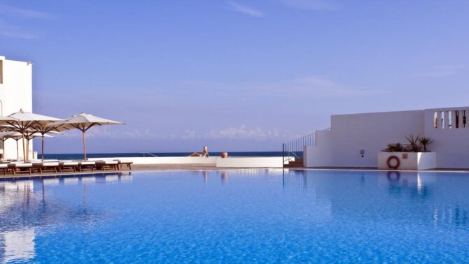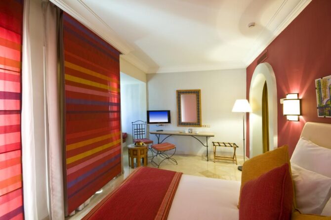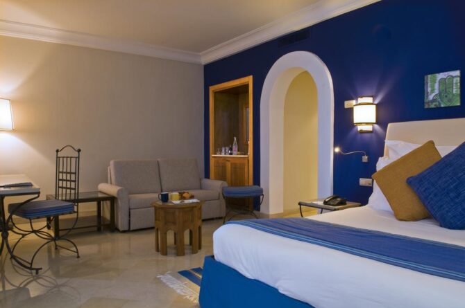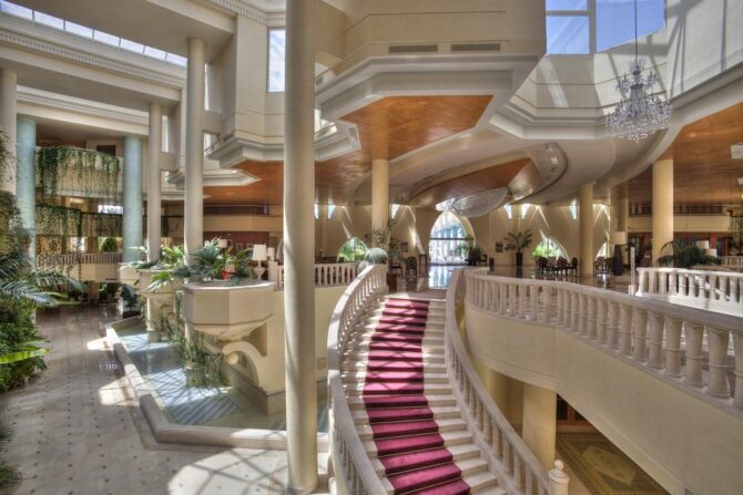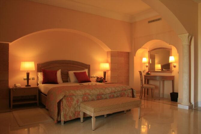 Шикарный пятизвездочный курортный комплекс на первой линии. Он построен еще в прошлом веке, поэтому здесь есть определенный шарм. Но помещения периодически ремонтируют, поэтому здесь гарантированно комфортное проживание. В просторных палатах мягкие кровати с ортопедическими матрасами, много подушек, современные плазменные панели, кондиционер, холодильник с мини-баром. Везде ловит скоростной бесплатный беспроводной интернет. Из многих спален наблюдается шикарный обзор на Средиземное.