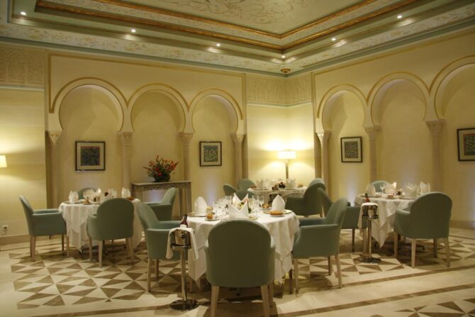 Четырехзвездочный Дар Диафа уверенно вошел в список лучших, так как обладает множество преимуществ. Он стоит в Эр-Рияде, в 10 минутах езды на автомобиле от города Хумт-Сук. Здание выполнено в арабском стиле, с белыми стенами и изысканными арками. Здесь можно окунуться в атмосферу Туниса. Вокруг лежат разноцветные подушки, ковры, можно посидеть и покурить кальян, глядя на морской прибой.