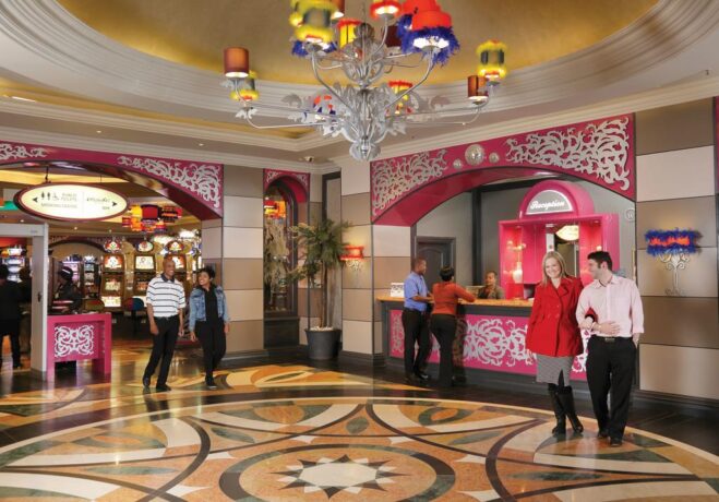 - Наиболее популярными карточными играми здесь является покер, блэкджек во всем их многочисленном разнообразии. Всего в казино можно насчитать сто пятьдесят столов с одиннадцатью играми. Помимо упомянутых игр естественной популярностью среди гостей пользуется рулетка.
