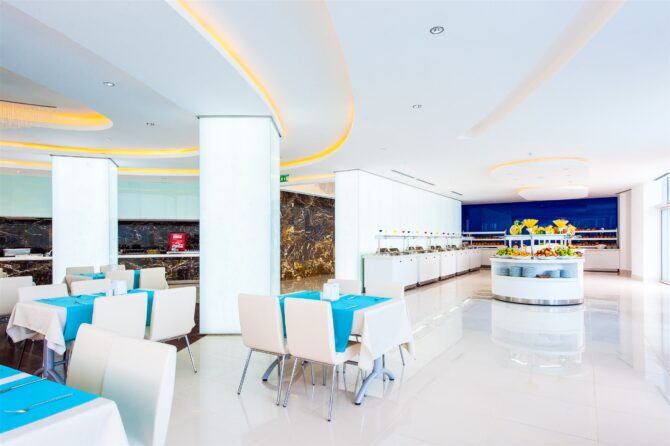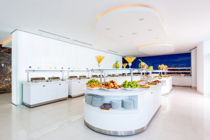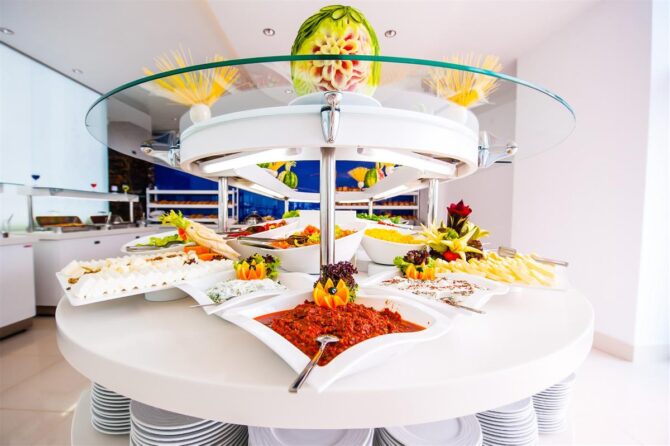 В отеле развита система питания, поэтому на протяжении дня вы можете отведать вкусные блюда разных кухонь мира в ресторанах. В основном ресторане накрывается шведский стол, где можно брать любую еду на выбор. Есть детское и диетическое меню. Кроме этого насладитесь холодными закусками, горячим, мясом, рыбой, сладостями. Нередко проводятся тематические ужины, а шеф-повара готовят перед публикой.