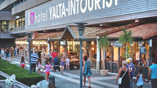 Полина, 27 лет: «Отель Ялта Интурист ничем не уступает забугорным четверкам, территория огромная, по началу даже можно заблудиться. В номерах есть все, даже одноразовые зубные щетки. Дети вообще попадают в рай, их привлекают животные в зоопарке, аквапарк, специальные площадки, настольный теннис. Каждый гурман сможет найти себе еду по вкусу, так как здесь много ресторанов разного уровня, даже быстрого питания. Есть магазины с сувенирами, одеждой, предметами быта, без подарков для друзей вы точно не уедите».