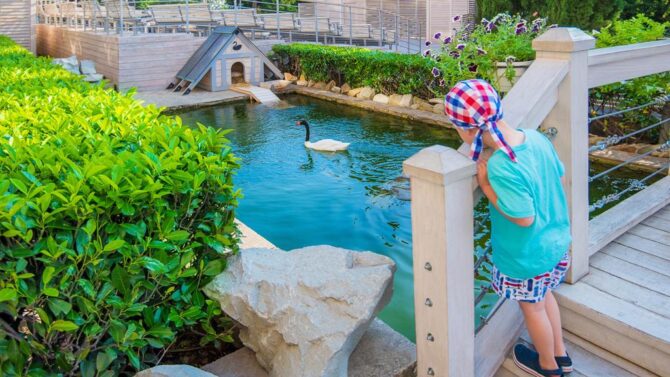 А также на территории расположено много ресторанов и кафе, бассейны, спортивные и детские площадки, контактный зоопарк.